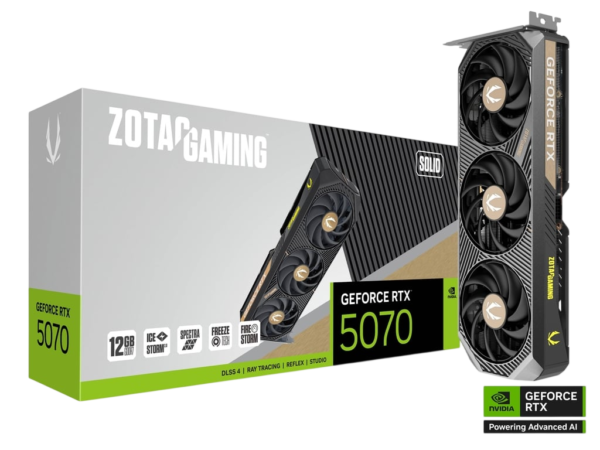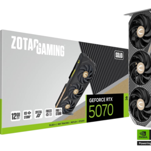 The ZOTAC GAMING GeForce RTX 5070 SOLID is a high performance, NVIDIA SFF-Ready graphics card that packs a huge punch in a compact form factor. Using NVIDIA’s cutting-edge Blackwell architecture, and features like DLSS4 and impressive cooling, the SOLID is built tough and hard-hitting in video games and professional workloads.